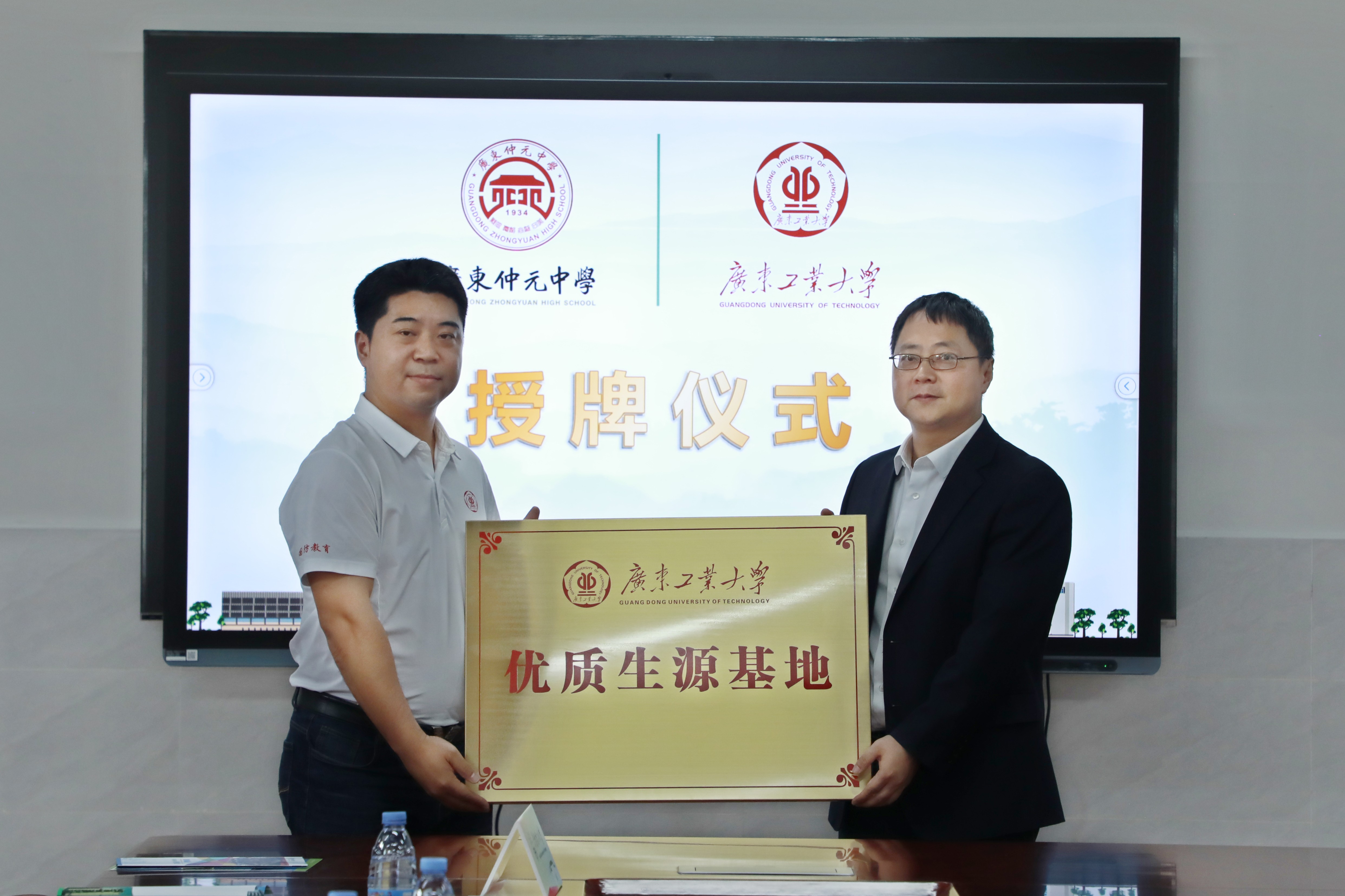 党委副书记石宇杰代表学校向中学授予“广东工业大学优质生源基地”牌匾,签署优质生源基地共建协议并赠送纪念品。
