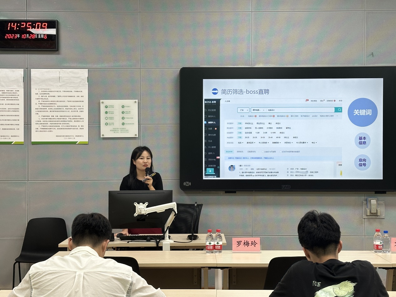 于10月28日在教学6号楼智慧课室209举办了就业能力提升实训营,本次实训营邀请了校友廖泽鉴先生、罗梅玲女士、柯慧怡女士、林汉钿先生和珠海天成先进半导体人力资源主管刘晓艳女士为学生们讲解求职过程中的各种“秘籍”,共有22位2024届、2025届的学生参训。